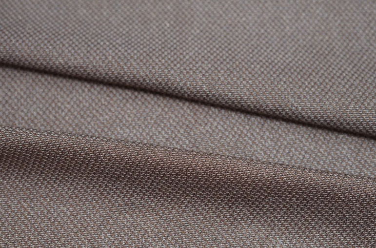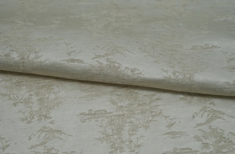 点评:经向采用R100D莱赛尔长丝,纬向采用再生粘胶/亚麻混纺纱,面料肌理细腻、垂感优异,兼具亚麻的透气性、粘胶的柔顺和莱赛尔的光泽感,细腻提花层次与织物肌理形成丰富视觉表现,适用于国风西装、衬衫及轻奢家居系列等。