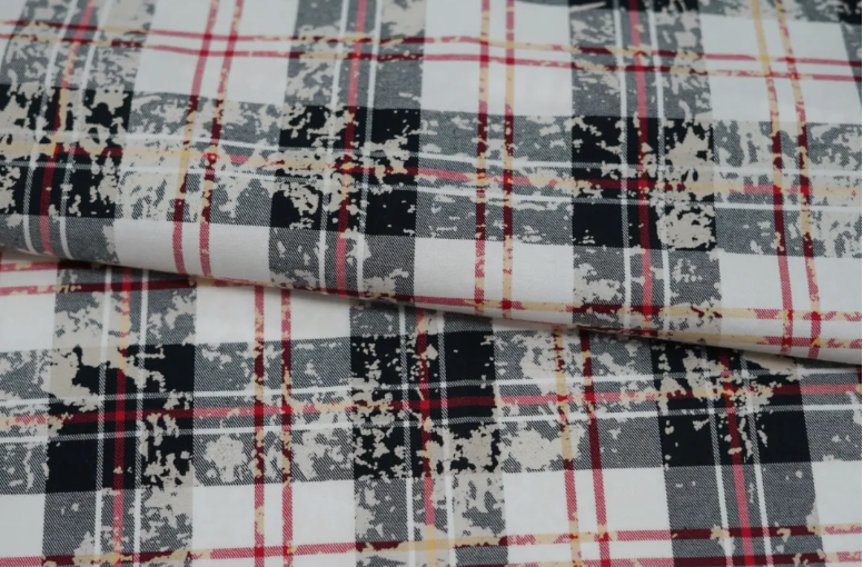 点评:采用100%棉纤维,面料柔软亲肤、吸湿透气,结合半拔染印花工艺,将经典英伦格纹与斑驳晕染肌理巧妙融合,展现中西方文化的交融与创新,赋予面料丰富的色彩层次与立体肌理,是印染技术中“技术”与“艺术”结合的典范,丝光整理提升面料光泽,单面拉绒工艺增强温暖触感和舒适度,适用于秋冬休闲衬衫等。