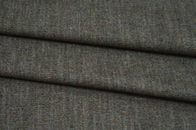 点评:采用全涤纶点子纱与原液着色T/R混纺纱交织,呈现彩点与竹节风格相结合的独特外观,增强视觉层次,兼具环保属性,四面弹结构实现多方向自由伸展,提升服装的贴合性、活动灵活性与舒适性,起毛工艺增强面料的温暖感,适用于商务休闲及都市通勤服装。