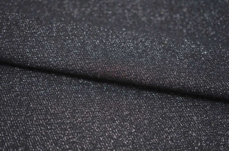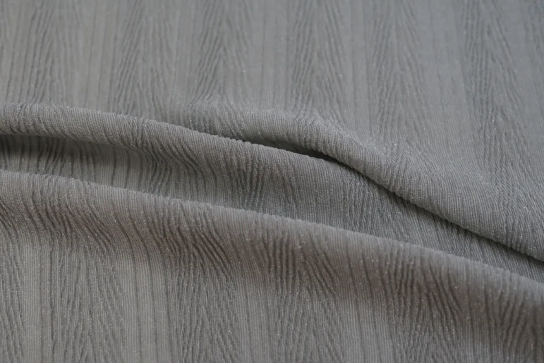 点评:经编针织面料以醋酸纤维为主,呈现丝绸般光泽与柔滑手感,金银丝点缀营造星光微闪的精致外观,涤纶丝增强骨感,结合压绉工艺,赋予面料树绉褶裥的独特立体层次,贴肤面亲肤柔软,兼顾舒适穿着与时尚视觉体验,适用于时尚女装及礼服等。